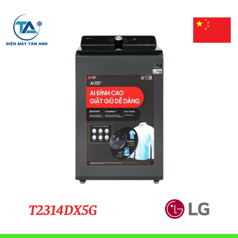 Máy giặt LG AI DD Inverter 14 kg T2314DX5G sở hữu kiểu dáng cửa trên – lồng đứng, phù hợp với thói quen sử dụng của người Việt. Thiết kế nhỏ gọn nhưng chắc chắn, tông màu trung tính giúp dễ dàng hòa hợp với nhiều không gian nội thất khác nhau. Nắp máy bằng kính cường lực trong suốt, chịu lực tốt, cho phép người dùng quan sát quá trình giặt bên trong một cách dễ dàng.