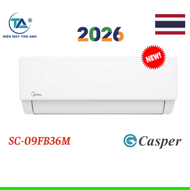 Điều hoà Casper 9000 BTU 1 chiều SC-09FB36M model 2026 là dòng sản phẩm hiện đại, mang đến khả năng làm lạnh mạnh mẽ, vận hành êm ái cùng nhiều công nghệ tiên tiến như BabyCare, Turbo, iClean và iFeel. Sản phẩm được sản xuất và nhập khẩu trực tiếp từ Thái Lan – quốc gia hàng đầu về công nghệ điện lạnh, đảm bảo độ bền và hiệu suất hoạt động ổn định.